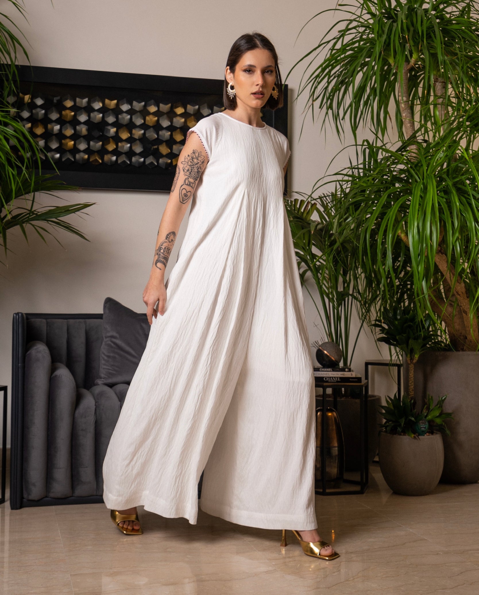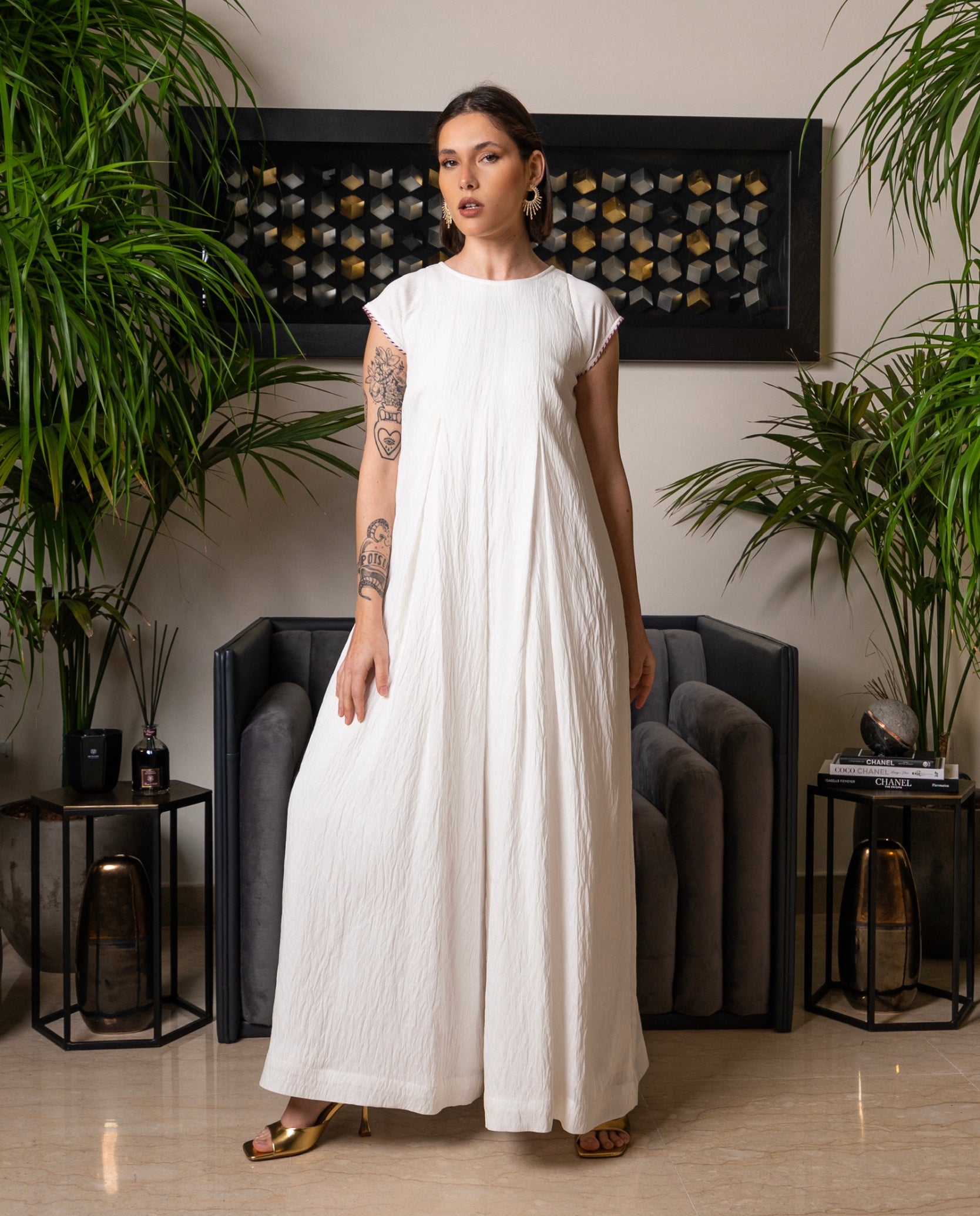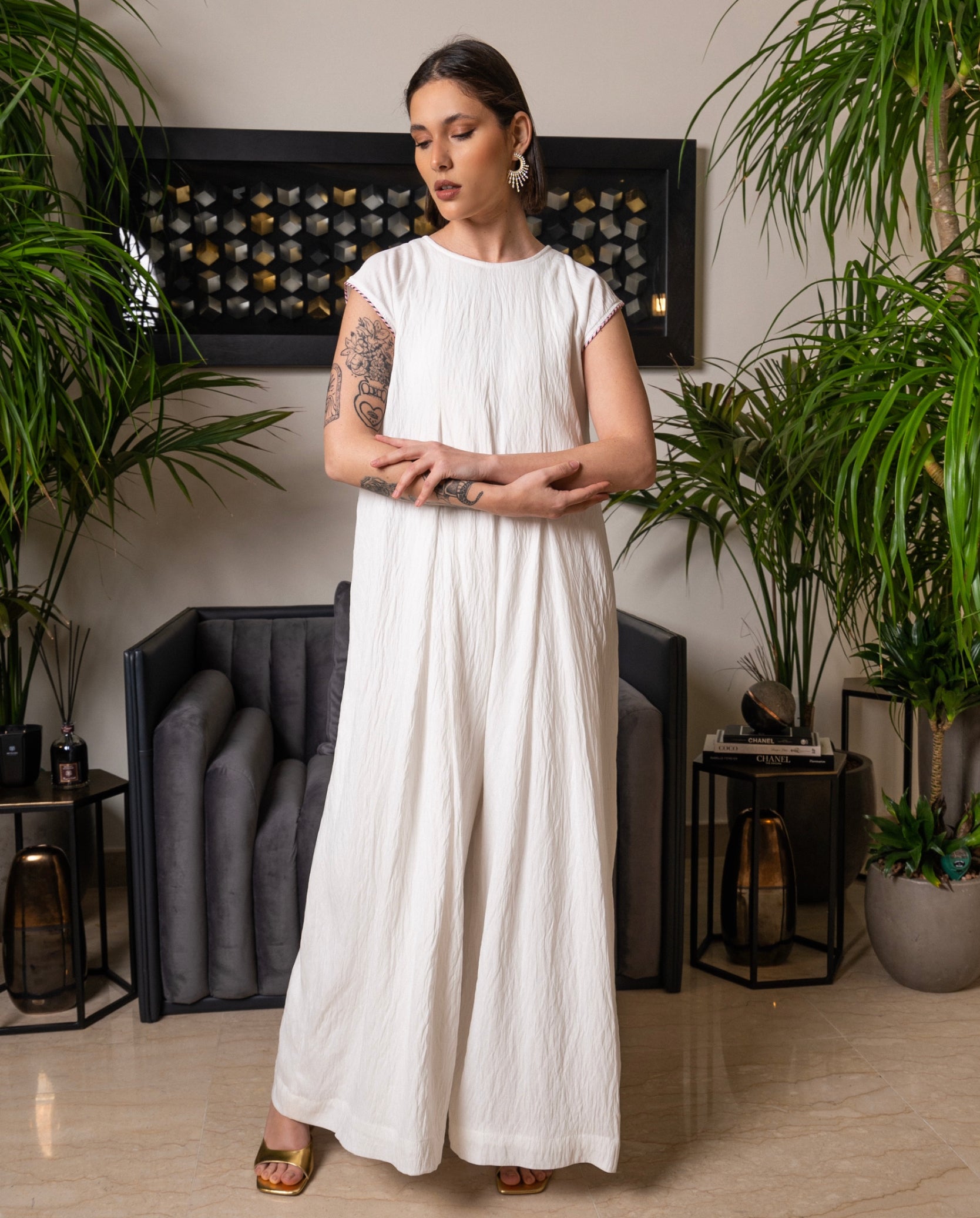 𖧹 White jumpsuit with pink and black details on the edge of the sleeves